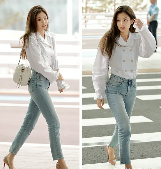 밝은 계열의 진으로, 흰색의 블라우스랑도 잘 어울리는 팬츠입니다. 모델분도 슬림하고 다리라인이 아름다우시지만, 역시 연예인은 다른걸까요. 제니가 입은 팬츠는 더욱 돋보이는거 같네요.
